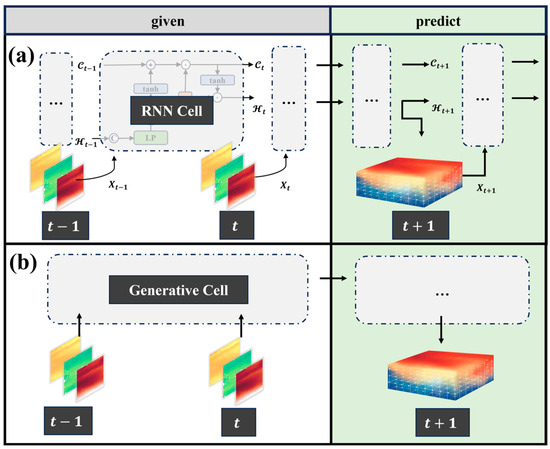 (a) Flow chart of RNN iterative framework on spatiotemporal prediction tasks. (b) Flow chart of the generative framework for spatiotemporal prediction tasks.