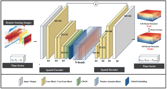 However, the iterative RNN-based spatiotemporal series models have inherent flaws. As illustrated in Figure 2a, the prediction for the current time step in an iterative model is influenced by the previous time step’s prediction, leading to error accumulation over time. Additionally, this process tends to make the model overly reliant on immediate past context information, hindering long-term information learning [43]. To address this issue, various generative models have been developed to generate all prediction results by capturing global information in a single step [39,44], as shown in Figure 2b. In 2023, Tan et al. [30] proposed the SimVP model, which uses an Encoder–Decoder architecture for feature extraction and large-kernel convolution to simulate a global attention mechanism, achieving excellent results in spatiotemporal prediction. With the advent of a new generation of satellites, remote sensing images now feature larger scales and higher resolutions. Consequently, the primary objective of this paper is to design an efficient artificial intelligence model that supports high-resolution images to predict the future three-dimensional structure of the ocean.