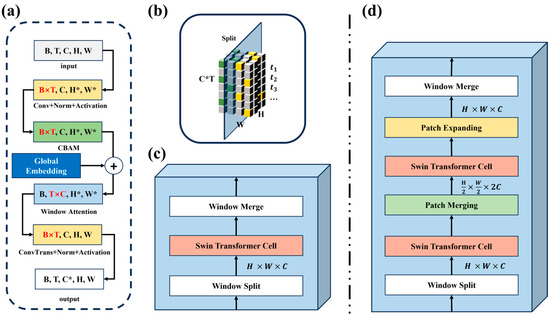 After spatial encoder, we reshape the dimensions of the tensor as . The purpose of this is to stack the single frame images at different times along the time axis and update the channel of the image to the combination of the doped time dimension. The tensor is then entered into the window attention module. For large-scale and high-resolution spatiotemporal series prediction tasks, the computational complexity of global attention is generally , and the spatial complexity is . Such square-level computational complexity causes a very large load on intensive prediction tasks [36]. By stacking time dimension and channel dimension, MSWO controls the matrix multiplication operation in smaller dimensions. The overall computational complexity of the model is , and the space complexity becomes , which greatly reduces the overhead of the model. In addition, inspired by the Swin Transformer [35] and SwinLSTM [40] models, we designed SWO and MSWO options in the window attention section, as shown in Figure 4c,d. SWO includes general window segmentation and a sliding window module. By dividing the whole image and performing attention calculation in the window, the computing overhead is further reduced. At this time, the whole image is divided into window matrices of size, and the computational complexity is reduced to , and the space complexity is . In MSWO, we use patch merging to acquire multi-scale image data, and through the residual joining operation, we can focus on a larger sensory field in the size window.