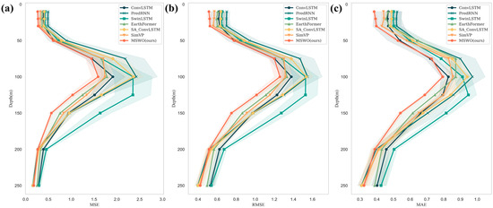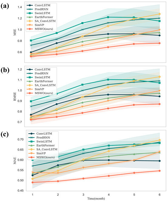 To illustrate the variations in predictive accuracy over space and time, we have plotted Figure 5 and Figure 6. Figure 5 presents the performance metrics of different models at various depths within the upper 250 m of the ocean, while Figure 6 shows the performance metrics across different months. All models exhibited a trend where the prediction error initially increases and then decreases, with the maximum error occurring around the 100 m depth. This corresponds to the thermocline, a transitional layer between warmer surface water and cooler deep water, characterized by a steep vertical temperature gradient. The thermocline significantly affects the ocean’s density and acoustic fields. Numerous previous studies [22,29,47,48] have highlighted the challenges artificial intelligence models face in accurately reconstructing subsurface structures due to the presence of the thermocline, posing a considerable challenge for all predictive tasks. For the study area, another challenge is the irregular variations in ocean structure caused by the El Niño–Southern Oscillation (ENSO) phenomenon. The limited availability of measured data hampers the ability of AI models to learn long-term decadal variations, thus obstructing accurate future predictions. Figure 6 shows how model errors change over time, with almost all models displaying an increase in error as the prediction horizon extends. This error increase is due to both the declining correlation between the output results and the real satellite data inputs, as well as the accumulation of errors from the recursive process. Overall, the MSWO model achieved the best predictive performance among all compared models, with the lowest error increase over time. This demonstrates that the MSWO model has broad application potential in the field of spatiotemporal sequence prediction.
