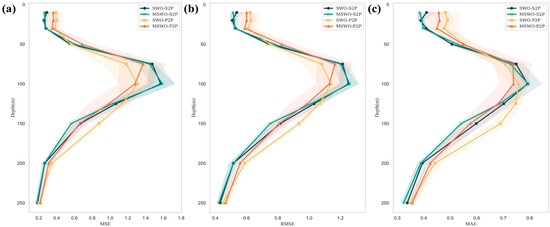 Evaluation index results of historical satellite remote sensing predicting future profile structure (S2P) and historical profile predicting future profile structure (P2P) models at different depths. (a) MSE, (b) RMSE, (c) MAE.