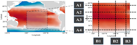 In this study, we utilized globally available datasets, including sea surface temperature (SST), absolute dynamic topography (ADT), sea surface salinity (SSS), and Argo-measured datasets. The temporal resolution for all data is monthly averages, and the spatial resolution was interpolated to 1° × 1° using interpolation methods. During the training and testing phases, satellite remote sensing data were integrated as input variables, and Argo profile data served as output variables. As detailed in Table 1, SST data were sourced from the National Oceanic and Atmospheric Administration (NOAA)’s OISST dataset, ADT data from Aviso, and SSS data from SMOS satellite’s Level 3 data. The study area encompassed the Central South Pacific, spanning from 44.5°S to 18.5°N and 116.5°W to 179.5°W. The input dimensions for the remote sensing images were 64 × 64 pixels. The temporal sequence of the dataset ranged from January 2011 to December 2019, encompassing 108 months. The time series data were divided into training, validation, and testing sets in a 7:1:1 ratio, employing a sliding window method [39]. The input time series covered 24 months, with predictions extending 6 months into the future. Argo depth selection focused on the upper 250 m of the ocean, divided into 10 depth layers (10, 20, 30, 50, 75, 100, 125, 150, 200, and 250 m). Outlier data were processed and optimally interpolated, and the following method was used for data normalization: