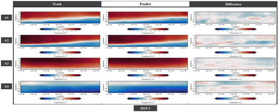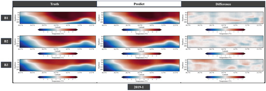 To further validate the consistency between the three-dimensional subsurface ocean structure predicted by MSWO and the measured data, we selected four latitudinal and three longitudinal transects for cross-sectional plotting. As shown in Figure 9, along the latitude direction, we selected four transects at 15.5°N (A1), 0.5°N (A2), 15.5°S (A3), and 40.5°S (A4), while along the longitude direction, we chose three transects at 169.5°W (B1), 139.5°W (B2), and 119.5°W (B3). We present the measured Argo profiles, predicted profiles, and their differences plotted along these transects using the MSWO model on the test dataset for January 2019, as illustrated in Figure 10 and Figure 11.