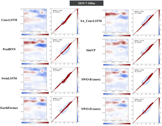 The planar error facilitates an understanding of the distribution of errors between the predicted results and the measured data, while the density scatter plot evaluates the correlation between the measured values and the model’s predicted results, as well as the robustness of the model’s performance. Thus, we generated planar error maps and density scatter plots for all baseline models in July 2019, focusing on the upper 100 m of the ocean. As depicted in Figure 12, significant errors were observed near the equator across all models, with the eastern Pacific displaying underestimations and the western Pacific showing overestimations, a pattern closely associated with the 2019 El Niño event. Overall, MSWO exhibited favorable performance advantages in predicting the development and changes in subsurface oceanic structures. Furthermore, compared to other baseline models, MSWO demonstrated the best robustness and most concentrated inversion effects in the density scatter plot.