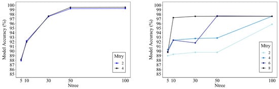 RF models are sensitive to hyperparameters, such as the number of trees (Ntree) and the number of randomly selected variables to split the nodes (Mtry) [55]. Here, the Ntree and Mtry were tuned using the k-fold cross-validation method. The cross-validation method divides the training set into k folds (here k = 10) . The model is trained on k-1 folds and tested on the remaining fold. The iteration continues until the model is tested at least once with each fold. Through this approach, an RF model was generated for each potential value of the hyperparameters, allowing us to identify the configurations that result in the highest accuracy. Figure 2 presents the average training accuracy of Sentinel and Landsat models with various combinations of Mtry and Ntree settings. The Landsat model tends to be stable after an Ntree of 50 with slightly better accuracy by increasing the Mtry from 2 to 4. On the other hand, the Sentinel model has the maximum and stable accuracy with an Mtry of 8 and an Ntree of 50.