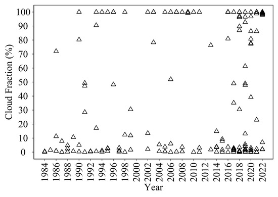 Distribution of cloud fractions of Landsat and Sentinel datasets from May 1 to May 30. Each open triangle corresponds to an individual image with a total number of 210. The cloud percentages were generated from the SRD boundary (the images were masked using the SRD shapefile to exclude land pixels).