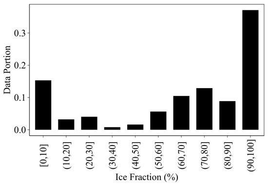 The ice and water percentages for the remaining images (cloud cover of 0–20%) were calculated from non-cloud pixels (ice portion + water portion = 1). To define the optimum values of thresholds for break-up onset, the training images were divided into ten categories based on the fraction of ice cover for each image (Figure 5). Therefore, the distribution of images could be effectively monitored for the purpose of maximizing data utilization. Given that Landsat images have a temporal resolution of 8 days on the SRD, the ice minimum threshold is critical to exclude images captured after the break-up onset period. Consequently, minimum and maximum ice cover thresholds of 60% and 90% were chosen as a trade-off to maximize data utilization while excluding images taken after the break-up onset period. During the break-up period, the images have an ice fraction of 60% to 90%, and the number of images during this period varies depending on the temporal resolution of data. When multiple images were available for a given year, originating from either different or the same satellites, the average day of break-up was calculated. To enhance the accuracy of this estimation, the average values were weighted using ice fractions as weights (Equation (3)).