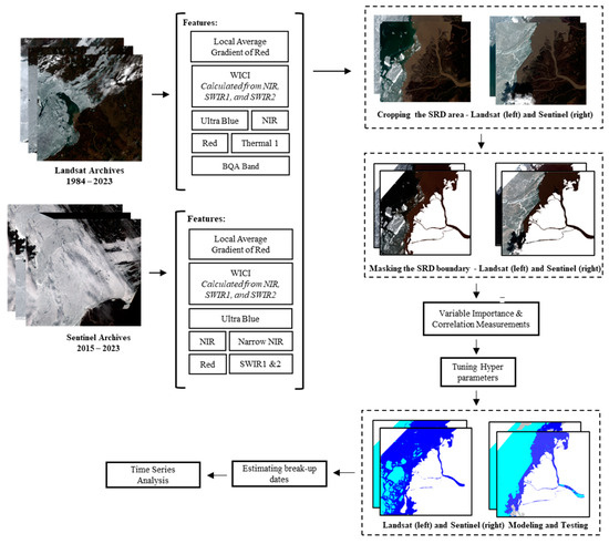 The Landsat and Sentinel RF models were found to have accuracies of 97.8% and 91.5%, respectively, using independent scenes, and were tested with images acquired from the PAD, demonstrating the robustness of the models to be used in different study areas. The initiation of the break-up process at the SRD was identified based on the ice and water portion calculated from the RF classification results. The results show a high degree of variability in the rate of break-up and a significant trend toward earlier break-up dates from 1984 to 2023, following the result of the Mann–Kendall test with a p-value of 0.05.