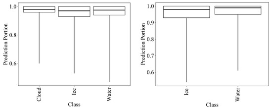 To further evaluate model uncertainty, probabilistic predictions of tree decisions were calculated. While RF classifies each pixel based on the majority vote of the trees, the degree to which the trees agree or disagree on a decision can indicate prediction uncertainty. Figure 8 presents boxplots for each class probability using training pixels. The minimum value represents cases where there is the most disagreement among the trees, while the maximum value of 1 indicates complete agreement among all trees. The distribution of values shows that, in most cases, the majority of trees tend to make the same decision for each pixel.