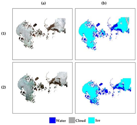 In terms of the pixel-based evaluation, training and testing accuracies were calculated. The training accuracy was based on 30% of the training set. This portion was not used during the model’s training phase but came from the same set of images as the remaining 70%. Therefore, the model had seen similar pixels. The testing accuracy was based on independent scenes that had not been seen by the model. In this regard, the balance between training and testing accuracies was monitored to avoid overfitting, which occurs when a model performs extremely well on the training data but poorly on the testing data. Image-based evaluation was performed by visual inspection between classified and RGB plots, and the calculated ice, water, and cloud percentages were cross-checked against the RGB plots to confirm their congruity. To assess the generalizability of the model, it was further evaluated with independent scenes captured from the PAD break-up process.