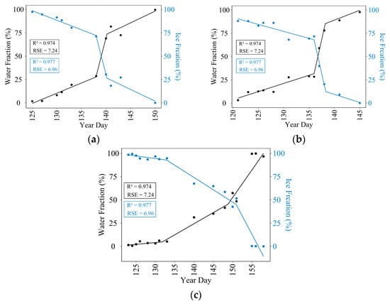 Analysis of cloud-free data from 2018 to 2021 with a higher temporal resolution than previous years provides insights into the varying rates of the break-up process, following the results of the RF models. Figure 10 presents the water and ice fractions of cloud-free images from 100% ice cover to 0%. A piecewise linear regression model was fitted to the water and ice fractions to better observe the rate of change [62]. The segmentation process was guided by two main factors: an initial guess based on our visual observation and the automated minimization of the Residual Standard Error ‘segmented’ package in R. The data indicate fluctuation and non-monotonic patterns in the rate of the break-up process. Figure 10 shows that a significant portion of ice break-up in 2018 and 2019 occurred rapidly, and the transition from the approximately 30% to 70% water fraction took only two days. In contrast, the same transition took 15 days in 2021. Break-up rates can be influenced by changes in air temperature and Slave River discharge. Faster rates reduce the likelihood of satellites recording the entire process of break-up.