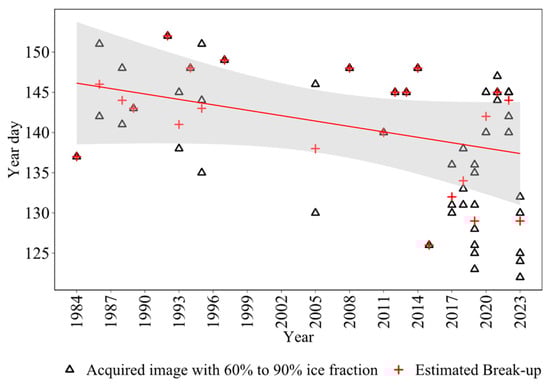 The earliest break-up event occurred on YD 126 in 2015, captured by an image with an ice fraction of 80.9%. Conversely, the latest break-up was observed on YD 152 in 1992 (Figure 11). Despite the inter-annual variability, a consistent declining trend in the break-up process was identified. The two-tailed Mann–Kendall test conducted from 1984 to 2023 yielded a p-value of 0.05, indicating a significant trend toward earlier break-up.