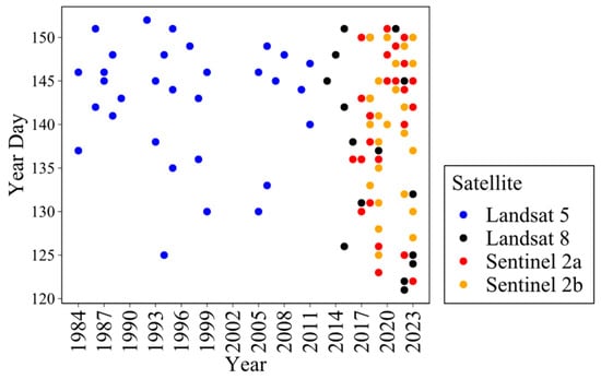 Images captured during the month of May with a less than 20% cloud fraction. Each color corresponds to one satellite. Landsat-5 started in 1984 and continued until 2011. Landsat-8 started afterward and remains active. Furthermore, to fill the temporal gaps in recent years, Sentinel data were used as supplementary data starting from 2015 and 2017.