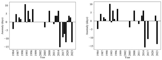 Break-up anomalies from 1984 to 2023 using Landsat archives (right) and a combination of Landsat and Sentinel archives (left). The y axis indicates the average value (zero) and the bars represent the differences in days of break-up estimates from the average value. A lower temporal resolution resulted in more temporal gaps; however, the years of 2015, 2017, 2022, and 2023 could be identified successfully without Sentinel records and have a similar estimation of the break-up onset date to the results with Sentinel records.