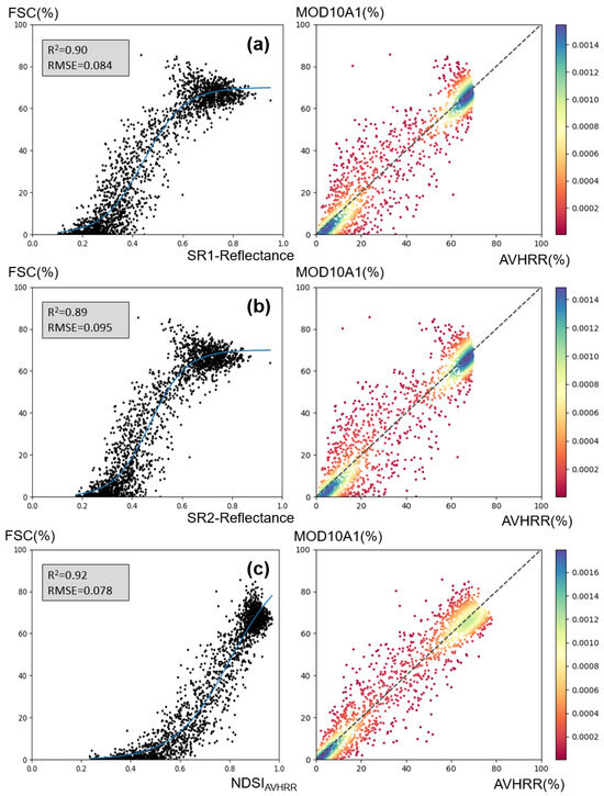 Linear fitting of SR1, SR2 and NDSIAVHRR with MOD10A1 for training data. The blue line represents the fit line, and the dash line represents the perfect prediction line. (a) the linear fitting of SR1 with MOD10A1; (b) the linear fitting of SR2 with MOD10A1; (c) the linear fitting of NDSIAVHRR with MOD10A1.