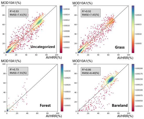 Scatter density plots for Logistic fitting results after considering elevation, slop, BT4 and comparison of predicted values with MOD10A1. The four subplots are related to uncategorized, grass, forest and bareland for vegetation cover types. The dash line represents the perfect prediction line.