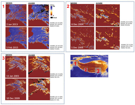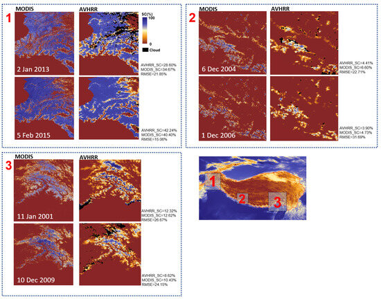 We compared the FSC inversion results of both the vanilla algorithm and the improved algorithm for six temporal phases between AVHRR and MODIS. As shown in Figure 5, across three test areas on the Tibetan Plateau the trends in snow cover percentage distribution were largely consistent between the two, with areas identified as cloudy in AVHRR also marked as non-snow in corresponding MODIS data, suggesting an alignment in cloud identification outcomes. This indicates the snow detection algorithm’s spatial reliability.