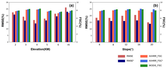 Trends in RMSE of AVHRR FSC inversion results with elevation and slope variation, using MOD10A1 as the ground truth. RMSE and AVHRR_FSC stand for the vanilla algorithm, RMSE* and AVHRR_FSC* stand for the improved algorithm. (a) trends in RMSE of AVHRR FSC inversion results with elevation; (b) Trends in RMSE of AVHRR FSC inversion results with slop.