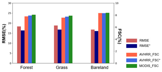 Trends in RMSE of AVHRR FSC inversion results with different vegetation types, using MOD10A1 as the ground truth. RMSE and AVHRR_FSC stand for the vanilla algorithm, RMSE* and AVHRR_FSC* stand for improved algorithm.