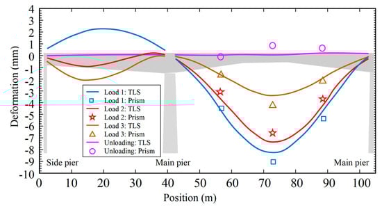 The proposed method was implemented in the deformation monitoring of the load tests of this bridge. At the same time, the traditional monitoring method of total station and prism combination, which is the most commonly used method in bridge monitoring, was adopted in parallel. Three prisms were installed on the side of the main girder using a lift truck positioned at L/4, L/2, and 3L/4 of the bridge’s midspan. The scanner used was a Leica P50, set up beside the pier of the midspan of the test bridge, allowing complete observation of the left side- and center-span areas. A scanning resolution of 3.1 mm @10 m was used, and the single measurement time was approximately 3 min. The distance between the farthest point of the midspan and the scanner was 65 m, and the corresponding noise standard deviation of the point cloud was about 1 mm. The total station used was Leica TS30, which was set up next to the pier of the side span. The distance between the farthest prism and the total station was 85 m. The automatic prism identification accuracy of the Leica TS30 was 1 mm. In terms of single-point measurement accuracy, the selected Leica P50 and Leica TS30 had comparable accuracy. The layout plan of measuring instruments and loading trains is shown in Figure 14. The scanner and total station maintained their positions throughout the test, indicating that the error ER described in Section 3.2 did not exist. The load was applied using a fully loaded train stationed at three preset loading positions. Given the varying positions of the train load, different deformations were induced on the test bridge.