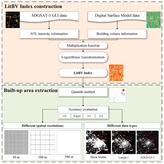 Therefore, this study attempts to combine NTL information with building information, integrating socio-economic and physical environment aspects to enhance the extraction effect of urban built-up areas based on SDGSAT-1 GLI data. The main contents include: (1) proposing a novel LitBV index, which combines NTL intensity and building volume; (2) applying the LitBV index based on SDGSAT-1 GLI data to extract urban built-up areas; and (3) testing the application prospect of the LitBV index in different spatial resolutions and different types of NTL data.