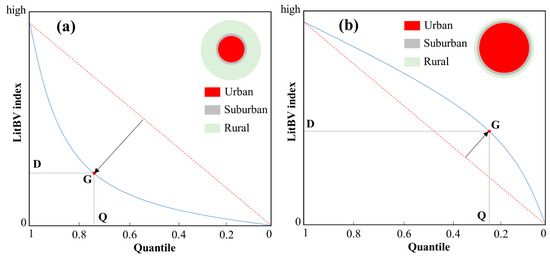 A conceptual model of quantile-based approach in a potential urban cluster for urban- (a) and rural (b)-dominated potential clusters. The blue curve is the quantile curve of the LitBV index value, and the red line is the reference line. Turning points (G) are identified locations (quantile level at Q with a threshold of DN value at D) with the maximum gap between these two lines (Zhou et al. [22]).