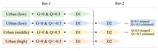 Downward heuristic rules of mapping different urban clusters (Li et al. [30]). The downward quantile method excludes pixels with LitBV index values higher than threshold D, first eliminating urban and suburban areas (D1), then rural areas (D2). The urban built-up areas can be divided after the rural areas are eliminated.