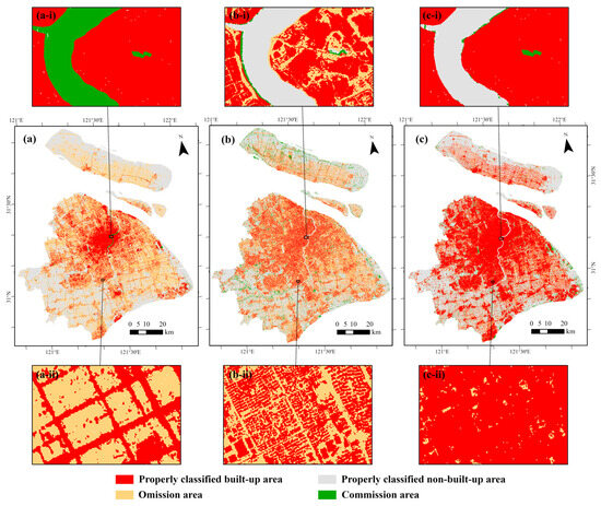 There is obvious blooming phenomenon in the original NTL remote sensing image, which leads to strong NTL intensity in the non-built-up area. Some of the non-built-up areas (green in Figure 7(a-i) is the river) are incorrectly identified as built-up areas. Urban night lighting mainly comes from street lamps [49,50,51], and in residential areas, night lighting is usually very low, which will cause the residential areas that originally belong to the built-up areas to be undetected (Figure 7(a-ii)). The volume of buildings represents the distribution of urban buildings well in the built-up area, and the road is obviously an important part of the built-up area. However, the building volume value of the road tends to 0, resulting in the omission of a large number of roads in the built-up area extraction results based on the building volume (Figure 7b). As can be seen from Figure 7c, the extraction results of built-up areas based on the log-transformed LitBV index can well avoid the commission of non-built-up areas such as rivers, effectively supplement the information of residential areas and roads, and greatly reduce the problems of commission and omission. The extraction results based on the log-transformed LitBV index are more consistent with the real built-up area distribution.