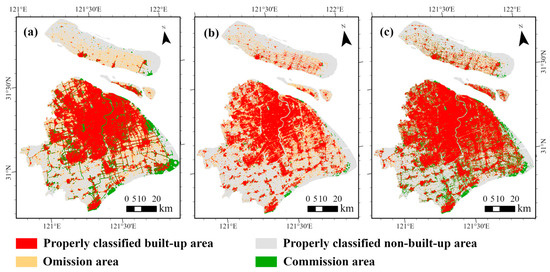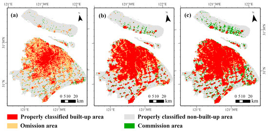 The downward quantile method was used to extract built-up areas at the two resolutions. At the 100 m spatial resolution, the threshold of division based on the original NTL data is 1.102, the threshold based on the building volume is 8225, and the threshold based on the LitBV index is 6.838. At the 500 m spatial resolution, the threshold based on original NTL data is 0.019, the threshold based on building volume is 259,759, and the threshold based on LitBV index is 11.478. Figure 9 and Figure 10 are the extraction results of built-up areas at 100 m spatial resolution and 500 m spatial resolution, respectively. It can be seen that at different spatial resolutions, there are still a large number of omission areas in the extraction results of built-up areas based on the original NTL data (yellow areas in Figure 9a and Figure 10a). In the extraction results of built-up areas based on the LitBV index (Figure 9c and Figure 10c), the area of correctly classified built-up areas was significantly improved. There are a few commission phenomena in the extraction results of built-up areas based on the LitBV index (green areas in Figure 9c and Figure 10c). The commissions mainly occurred in the southeast of Shanghai and Chongming Island in the northeast. In recent years, the urbanization of these two areas has developed rapidly, and the land cover type has changed rapidly. The existing land cover data are based on the annual average status to identify the land cover type, so the current land cover reference data in these rapidly changing regions have a certain uncertainty, resulting in a poor comparative verification effect of the extraction results in this paper. In fact, the construction of buildings and lighting infrastructure usually means that the area has been developed as a built-up area, so the extraction results of the built-up area with the LitBV index integrating building information and night lighting information may be more realistic. In the quantitative evaluation (Table 2 and Table 3), the accuracy of built-up area extraction based on original NTL data is less than 70%, while the accuracy of built-up area extraction based on the LitBV index is more than 80%. Although the AA accuracy of the built-up area extraction results based on original NTL data and building volume is higher, the overall performance of the built-up area extraction results based on the LitBV index is better. Moreover, the extraction accuracy at 500 m spatial resolution is higher than that at 100 m spatial resolution.