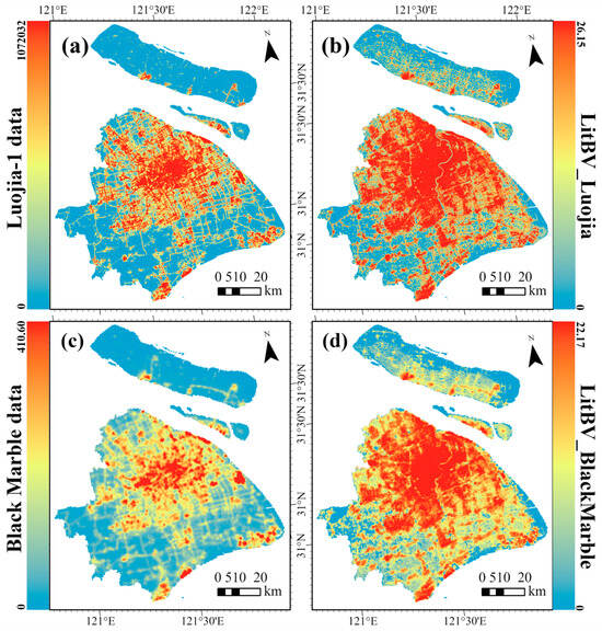 LitBV index based on different data. (a) Luojia-1 data; (b) LitBV index based on Luojia-1 data; (c) NASA’s Black Marble data; (d) LitBV index based on NASA’s Black Marble data.