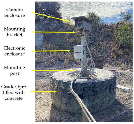 The autonomous terrestrial stereo-pair photogrammetric monitoring system developed in [] was used for the experimental investigation. It comprises two stand-alone units designed to detect volumes falling from sub-vertical rock faces, particularly in surface mining environments. Each unit is housed within an IP67 weatherproof box, ensuring protection from environmental elements, and includes essential components such as a digital single-lens reflex (DSLR) camera, a single-board microprocessor, and an uninterruptible power supply (UPS). The camera utilized is a full-format Nikon D850, boasting a resolution of 45.4 megapixels, that can be equipped with fixed 50 mm focal length optics (AF-S Nikkor 50 mm f/1.8 G Lens) or fixed 85 mm optics (AF-S Nikkor 85 mm f/1.8 G Lens). Integrated with the DSLR camera is a Raspberry Pi 3 Model B (RPi3B) single-board computer, serving as the control hub for acquisition parameters. The RPi3B features an integrated wireless LAN (WLAN) module, enabling seamless connectivity to an external Wi-Fi network for remote control and monitoring. Each unit is powered by a 60 W solar panel and a pair of 26 Ah batteries stored within an IP66 enclosure box. Mounted on the exterior of the camera box is a 5/8” prism mounting screw, which facilitates the temporary installation of a survey prism or GNSS receiver for precise spatial referencing. Moreover, recent redesign efforts by [] have enhanced the system’s versatility and adaptability. These improvements include provisions for easy installation in diverse locations, adjustable camera box setups to accommodate tilt and rotation for site-specific fields of view, compatibility with different lenses, optimization of the circular sealed aperture, and the incorporation of a shading screen (see Figure 1).
