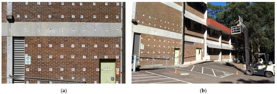 The anticipated camera-to-object distances ranges from 50–100 m. At these distances, it is impractical to establish a calibration field that can be accurately framed for visibility whilst having targets in all areas of the camera sensor. Hence, for this experiment, an ad hoc target field of appropriate size was set up, assuming that for distances greater than a few dozen meters, the focus (and consequently the optical characteristics) of the camera does not change substantially. The camera is housed in a protective box; hence, the optical path of the light rays is influenced not only by the camera’s optics but also by the protective glass panel placed in front of the camera. For this reason, calibration must take place with the camera mounted in a fixed position inside the protective box, which creates further complications by requiring the use of a remote shutter button for image acquisition. The FF calibration of each camera of the fixed monitoring system was performed at the University of Newcastle (NSW, Australia). A north-facing brick wall was equipped (Figure 2) with 70 coded targets placed on approximately seven different heights (the approximate distance between adjacent targets was 65 cm horizontally and 75 cm vertically), encompassing a total area of about 6 × 4.5 m2.