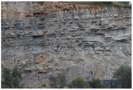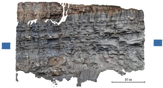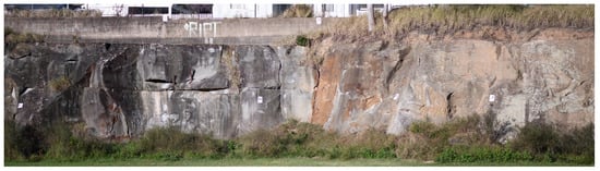 The first (indicated as Site 1) was an abandoned sandstone quarry located at Pilkington Reserve in Newcastle (NSW, Australia). The exposed rock face extended approximately 80 m in length and had an average height of about 6 m (Figure 6). Both a 50 mm and 85 mm lens were considered in the experiments. The area framed by the cameras was approximately 6.5 m high, and 41 and 28 m long for the 50 and 85 mm lenses, respectively.
