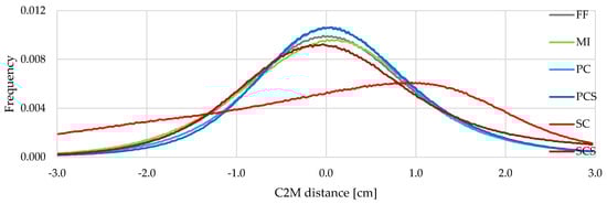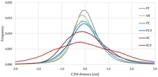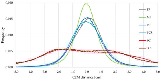 The results from C2M of the point clouds generated using three GCPs are summarised in Figure 14 and Figure 15. The average distances from the reference mesh, the RMSE, the number of points of the 3D models, and the percentage of points higher than 24 mm or lower than −24 mm (threshold determined as four times the expected precision of the monitoring system, in this configuration, in ideal conditions) are reported in Table 4. The frequency distribution of the deviations of the point clouds from the reference mesh is illustrated in Figure 14. The differences of the point clouds of the object based on a coloured scale from −24 mm to 24 mm are shown in Figure 15. For this test, FF, MI, PC, and PCS produce similar results: the RMSE is about 8 mm (1.8 GSD), less than 3.1% of the points have a difference higher than ±24 mm with a good interpretation of the object (see Figure 15a–d) and the differences have a Gaussian distribution (see Figure 14). However, the right-hand side of the SCS model indicates an increase in positive differences (see Figure 14 and Figure 15f). The RMSE is 8.9 mm (2.0 GSD) with a higher number of points (6.5%) bigger than the threshold. For this third test, SC did not produce a reliable model. The RMSE is 11.7 mm (2.6 GSD), and it has about 14% of the points bigger than the threshold (±24 mm) with systematic deformation (see Figure 15e) and an asymmetric difference distribution (see Figure 14).