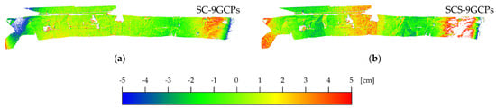 Results from C2M distance of Site 1—50 mm lens using 9 GCPs. Deviation between the reference mesh and point clouds generated using different types of calibration: (a) SC and (b) SCS.
