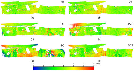 Results from C2M distance of Site 1—50 mm lens using 3 GCPs. Deviation between the reference mesh and point clouds generated using different types of calibration: (a) FF; (b) MI; (c) PC; (d) PCS; (e) SC; and (f) SCS.