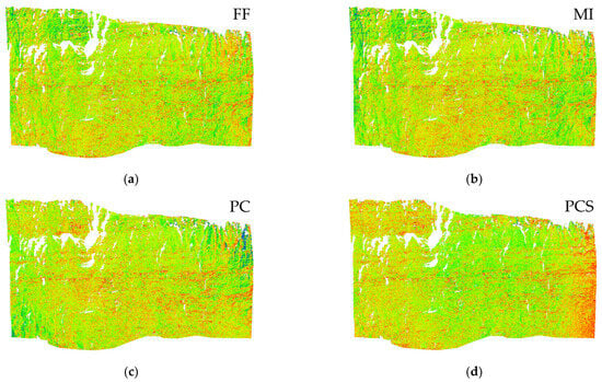 The results presented in this section detail the comparison between the 3D point cloud generated from stereo-pair images of Site 1 captured with the 50 mm lens using the calibration methods outlined in Section 2 and the 3D reference mesh obtained from the TLS. The comparison was conducted utilising the C2M distance in CloudCompare []. Two analyses are presented in the following. The first compared models obtained using three GCPs from the six calibration tests (FF, MI, PC, PCS, SC, and SCS). The second analysis varied the number of GCPs (zero or nine GCPs) for four types of calibration, PC, PCS, SC, and SCS.