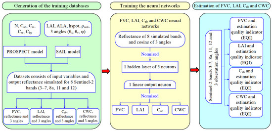 - Bacour, C.; Baret, F.; Béal, D.; Weiss, M.; Pavageau, K. Neural Network Estimation of LAI, FAPAR, FCover and LAI× Cab, from Top of Canopy MERIS Reflectance Data: Principles and Validation. Remote Sens. Environ. 2006, 105, 313–325. [Google Scholar] [CrossRef]
