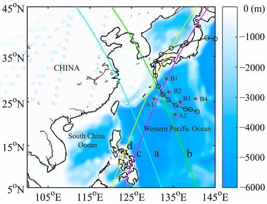 Bathymetric display of the western Pacific domain and the location information of the data set are presented. The black “−o” line indicates the path of Typhoon Nanmadol, with the typhoon making landfall in Japan from the western Pacific Ocean; the circles along the path represent the position of the typhoon at 12 h intervals. The red “+” markers (A1−B4) denote the locations of the Argo floats; the straight line (a−d) illustrates the Jason-3 altimeter’s trajectory over the western Pacific during the typhoon.