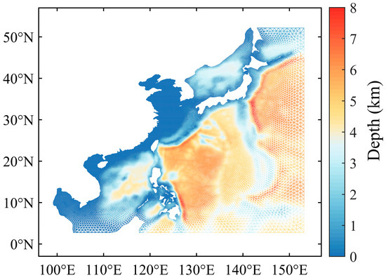 The simulated area involves the western Pacific, with a latitude and longitude of 100–155°E and 2–51°N, including many complex terrains such as the Philippine Islands, Taiwan Island, Japan Island, and the Ryukyu Island chain (Figure 1). High-precision Shoreline GSHHS was used to characterize the study area (https://www.ngdc.noaa.gov/mgg/shorelines/gshhs.html, accessed on 1 January 2024), and a unstructured triangular mesh was used to fit the complex shoreline and terrain (Figure 2). The water depth data were obtained by using ETOPO5 (5-min Gridded Global Relief Data) high-precision terrain data interpolation and smooth adjustment (https://www.ncei.noaa.gov/products/etopo-global-relief-model, accessed on 1 January 2024).