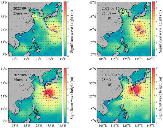 Typhoon Nanmadol generated powerful, typhoon-induced waves. Figure 3 displays four key stages of changes in effective sea surface wave height and influence range due to the significant impact of Typhoon Nanmadol’s wind field. On 15 September (Figure 3a, UTC), Nanmadol transitioned from a tropical cyclone to a typhoon. The central wind speed reached approximately 33 m/s, generating waves about 5.5 m high to the east of its path, with a limited impact on the overall effective wave height. From 16 to 17 September (UTC), as depicted in Figure 3b,c, Nanmadol matured into a super typhoon. The central wind speed peaked at 62 m/s, generating waves about 12 m high in the western Pacific region, with a maximum height of 13.4 m. The area of impact significantly expanded, reaching the East China Sea. On 18 September (UTC), as shown in Figure 3d, Nanmadol developed two eye structures and began the process of eye-wall replacement prior to landfall. This phenomenon, where a strong typhoon replaces a smaller eye with a larger one, is part of its structural adjustment and represents a vulnerable phase during which the typhoon’s intensity typically weakens [49]. Landfall occurred during the critical period of Nanmadol’s eye-wall replacement, which was unsuccessful, leading to the typhoon striking Japan in this vulnerable state. Prior to the typhoon’s landfall, despite the wind field being less intense than at its peak, Nanmadol still generated waves reaching up to 10 m in height on the southern islands of Kyushu.