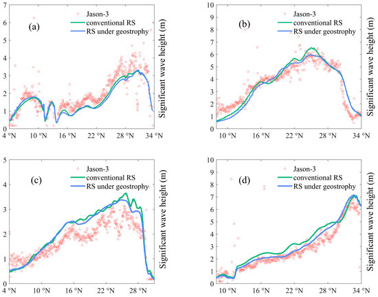 The numerical simulation results of effective wave height were compared with the Jason-3 satellite altimeter data. (a–d) represent each of the four orbits of the altimeter satellite.