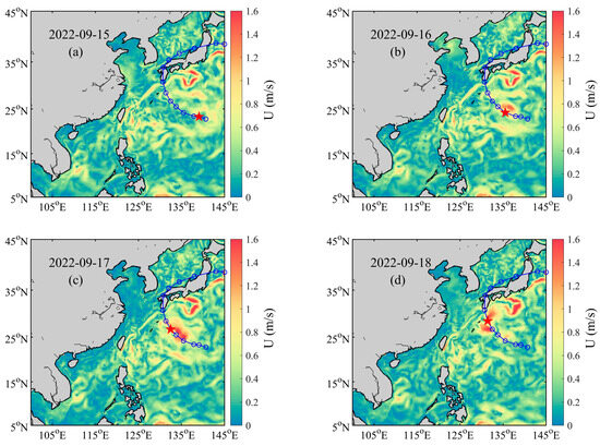 The ocean flow field simulation covered a period from 14 September 2022 (UTC) at 00:00 to 19 September 2022 (UTC) at 00:00, amounting to a total of 5 days. As shown in Figure 5a,b, before 17 September, the flow induced by the typhoon displayed a vortical pattern in the western Pacific Ocean. The flow velocity was lowest at the typhoon’s core, exhibiting a counterclockwise rotation and anticyclonic direction that extended outward. Due to the typhoon’s asymmetrical structure, the flow velocity on the right side, relative to the typhoon’s direction of movement, was greater than that on the left, reaching a peak of 2 m/s. The typhoon progressively moved northward until 18:00 on the 17th (UTC). For instance, as illustrated in Figure 5d, the outer edge of the northern side of the typhoon’s ocean vortex neared the Kuroshio. Concurrently, the typhoon sustained its intensity and the oceanic vortex exhibited robust circulation.