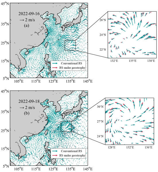 Conventional RS and geostrophic effect RS were utilized to simulate the ocean flow field under Typhoon Nanmadol. Two significant phases were analyzed: 16 September (UTC), when Typhoon Nanmadol evolved into a super typhoon (Figure 6a), and 18 September (UTC), when it reached peak strength (Figure 6b). To provide a clear comparison, the velocity vector fields of the two schemes were overlaid on a graph. Observations revealed minimal differences in the overall flow field intensity between the two simulations, with both generating extensive typhoon-induced vortices. However, in the ocean current divergence regions surrounding the vortices, the divergence amplitude of the surface flow field due to radiation stress within the geostrophic effect was more pronounced, leading to increased velocities. These results indicate that the rightward force of waves induced by geostrophic wave radiation stress under the typhoon field in the northern hemisphere changes the direction of outward divergence of water flow from the vortex center. At the same time, the velocity increases, the turbulent mixing degree of the surface layer of the vortex is enhanced, and the exchange of materials in the upper ocean is intensified, thus causing the temperature of the upper ocean to decrease and the mixing layer to deepen.