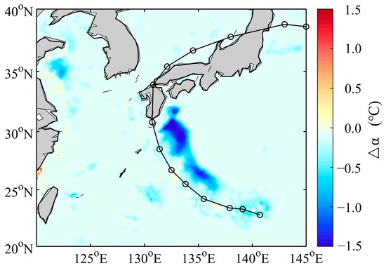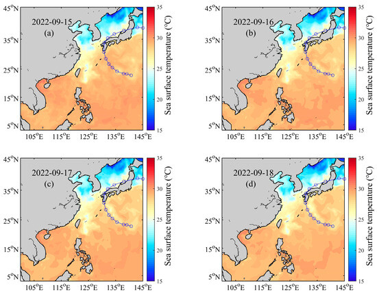 The sea surface temperature (SST) plays a pivotal role as a forcing mechanism between the ocean and the atmosphere, profoundly influencing the formation, path, and strength of typhoons. In turn, the passage of typhoons can significantly modify the SST. Under the influence of a typhoon’s strong wind stress, surface waters within the typhoon’s ocean vortex are pushed away from the center, resulting in seawater divergence and the upwelling of deeper waters. As a result, the SST in the region experiencing the most intense divergence of the typhoon’s ocean vortex becomes noticeably cooler compared to surrounding areas of the vortex [51,52,53].
