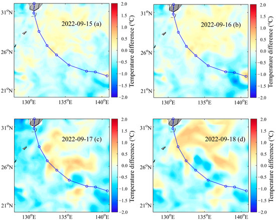 The sea surface temperature (SST) simulated by the geostrophic effect radiation stress scheme illustrates the overall scenario. The SST on 15 September (UTC) is considered the initial temperature, and the variations in SST across different periods are depicted in Figure 7. Intense mixing and upwelling induced by typhoons result in a decrease in SST. One to two days following the peak typhoon wind speed, the SST experiences the most significant reduction. In the early phase of the typhoon, its strength and the consequent upwelling and divergence are minimal, resulting in a less pronounced decrease in SST. On 17 September at 2:00 UTC (Figure 7c), the typhoon’s central wind speed reached a peak of 62 m/s, coinciding with a substantial decline in SST. The most notable drop in SST occurred on September 18 (Figure 7d, UTC), one day after the maximum wind speed, with temperatures decreasing by approximately 2.5 °C. The reduction in sea surface temperature (SST) propagated from southeast to northwest.