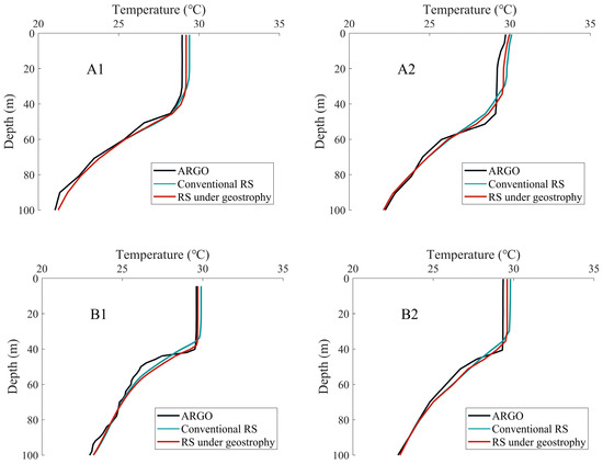 Comparison of observed sea water temperature and numerical simulation temperature profile with Argo floats; (A1–B4) indicate the locations of the Argo floats.