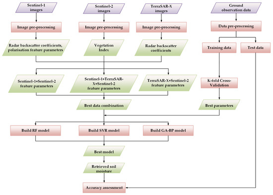 Data acquired from three different remote sensing satellites, which were C-band Sentinel-1, X-band TerraSAR, and Sentinel-2, were employed in this study, combining GA-BP, SVR, and RF models to construct an SSM inversion model. The main contributions of this study can be summarized as follows: (1) Differences in the potential C-band and X-band SAR remote sensing data in SSM inversion were explored and validated. (2) The abilities of three machine learning models, GA-BP, SVR, and RF, were compared in terms of SSM inversion. (3) The parameters of the three machine learning models were optimized through the cross-validation method, demonstrating the impact of model parameters on model performance. Therefore, by combining multi-band remote sensing data, a new approach to SSM monitoring in the context of small-sample datasets was offered by this study.