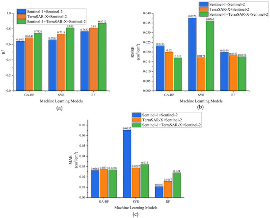 The R2, RMSE, and MAE results of the model on the training set are shown in Figure 4. Compared with the test set, it could be seen that the model did not exhibit overfitting or underfitting. Furthermore, the combination of Sentinel-1, Sentinel-2, and TerraSAR data (green bars) achieved the best overall performance. This indicates that the combined use of multi-band remote sensing data could significantly enhance the model’s performance.
