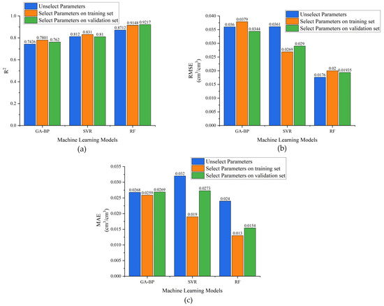 The R2, RMSE, and MAE results of the model on the training set and validation set are shown in Figure 5. Compared with the test set, the model did not exhibit overfitting or underfitting. Additionally, the figure indicated that adjusting the parameters of the machine learning models led to an improvement in inversion performance. This demonstrated that parameter adjustments had a significant impact on the performance of machine learning models.